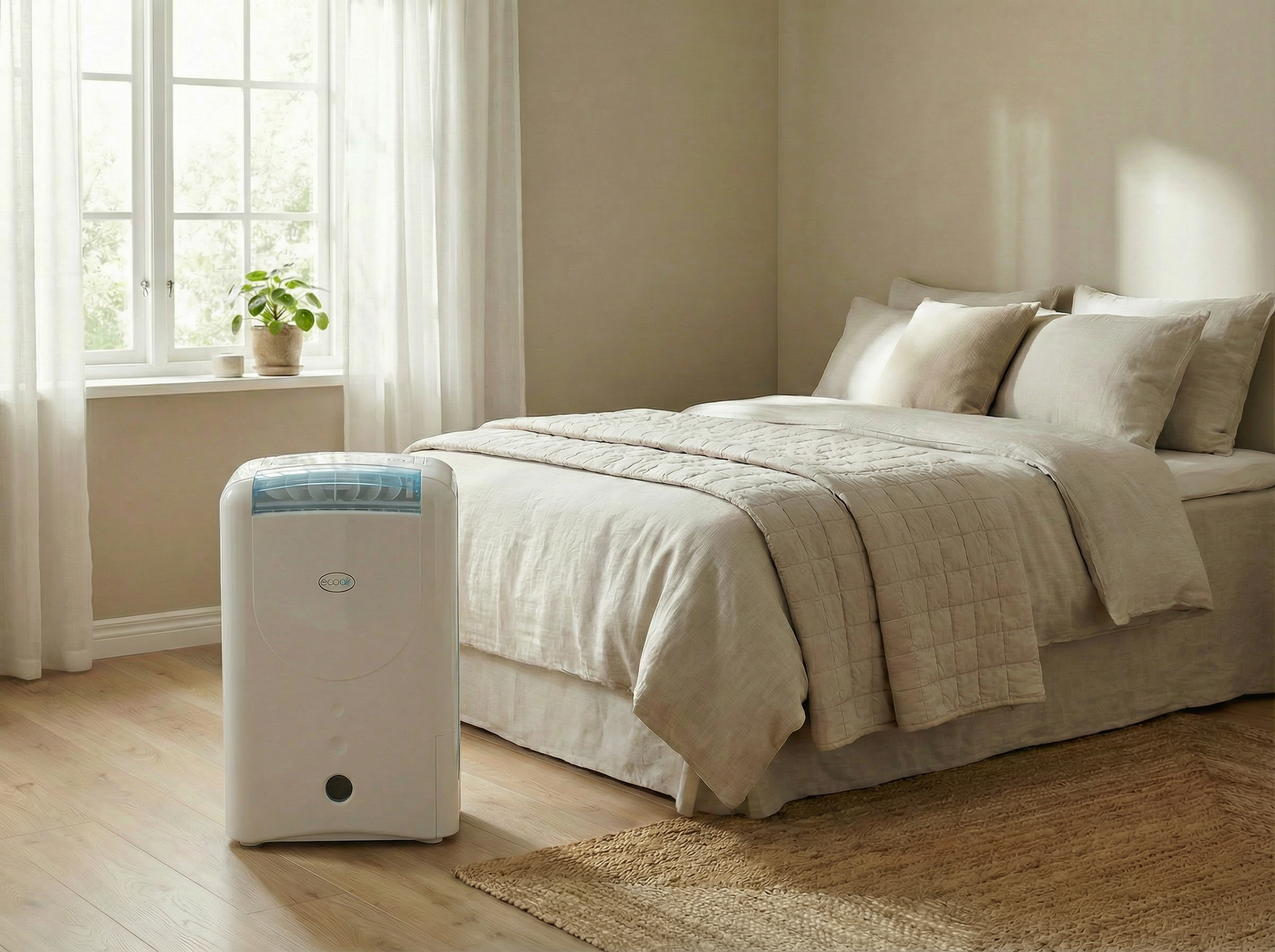 EcoAir DD1 Simple MK3 ist einfach zu bedienen und reduziert effektiv die Luftfeuchtigkeit. Wählen Sie mit dem Drehknopf die gewünschte Feuchtigkeitseinstellung „Niedrig“, „Mittel“ und „Hoch“, um die Entfeuchtungsintensität einzustellen, und mit dem Schieberegler den Eco-, Turbo- und Wäsche-Modus. Der ECO-Modus begrenzt den Stromverbrauch und den Geräuschpegel. Im Turbo-Modus entfaltet das Gerät seine ganze Kraft, um die Luftfeuchtigkeit so schnell wie möglich zu reduzieren. Nasse Wäsche trocknen? Besonders schnell dank Dauerbetrieb zum schnellen Trocknen nasser Wäsche.